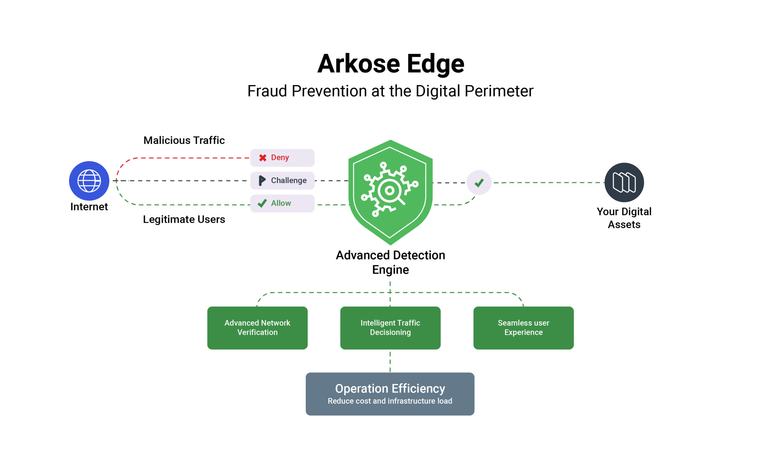 Arkose Edge delivers powerful server-side protection through a streamlined API solution that seamlessly integrates into your infrastructure with a lightweight call at any endpoint, collecting essential data signals to deliver intelligent risk assessments and actionable allow/challenge/deny recommendations based on comprehensive consortium intelligence.